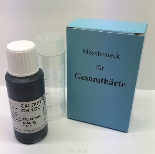 Testerem można oznaczyć wodę twardą na próbce 5ml wody, każda kolejna kropla oznacza 1 °dH.